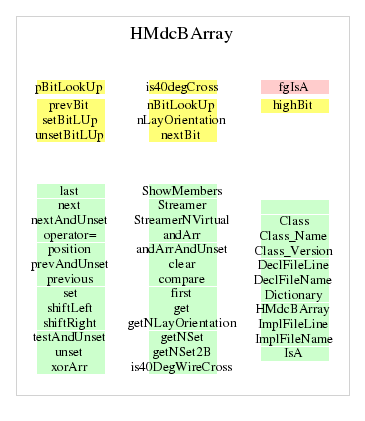 _HADES_CLASS_DESCRIPTION HMdcTBArray LookupTable and some useful functions for working with an array of two bits. For MDC it can be used for keeping information about number of cell times: only time1 - 1 only time2 - 2 time1 & time2 - 3 void clear(UChar_t *pF, UChar_t *pL); void set(UChar_t *pF, Int_t pos, UChar_t cont); Int_t get(UChar_t *pF, Int_t pos); void unset(UChar_t *pF, Int_t pos, UChar_t cont); Int_t getNSet(UChar_t *pF, UChar_t *pL); Int_t position(UChar_t *pF, UChar_t *pL, Int_t idx); = content of two bits or =-1 Int_t first(UChar_t *pF, UChar_t *pL); = content of two bits or =-1 Int_t last(UChar_t *pF, UChar_t *pL); = content of two bits or =-1 Int_t next(UChar_t *pF, UChar_t *pL, Int_t prPos); = content of two bits or =-1 Int_t previous(UChar_t *pF, UChar_t *pL, Int_t prPos); = content of two bits or =-1 void shiftRight(UChar_t *pF, UChar_t *pL, UChar_t *pS); void shiftLeft(UChar_t *pF, UChar_t *pL, UChar_t *pS); Int_t compare(UChar_t *pF1, UChar_t *pF2, Int_t nBytes); pF - pointer to the first byte of bytes array pL - pointer to the last byte of bytes array cont - content of two bits, can be = 0,1,2,3 pos - position of element in two bit array (for examp. - num. cell MDC) idx - index of element prPos - position of the element, used for geting position of the next or previous position aftre or before pos. prPos pS - pointer to the byte which mast be moved to *pL (shift to right) or to *pT (shift to left)