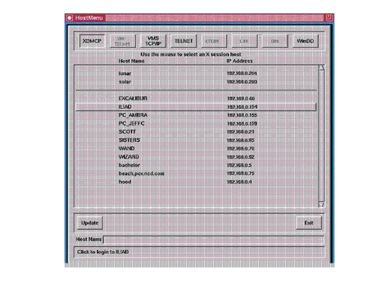 - Using the mouse, position the pointer on a host computer where you have a login account. If your host is not displayed, try the Update button or look for your host on one of the other lists (change lists by clicking one of the list buttons across the top).