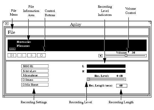 The first xpsh example above starts the aplay client on a network computer named sierra; the second starts the Audio Player with the host eugene and the audio file /usr/adam/story.au preloaded in the Audio Player's File Information Area; and the third example plays the audio file /usr/adam/story.au (located on the host eugene) on the network computer without opening the Audio Player.