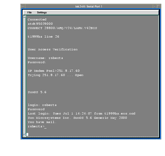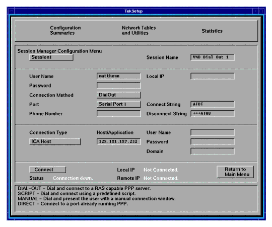 When you click the Connect button for a Manual session, one of the provided scripts (start_man) will start, launching a TIP window and dialing the number specified in the Session Manager Configuration Menu. The start_man script prompts you for your username and password. If the PPP daemon is not running on the Host, you will have to start it manually. The TIP window closes automatically as soon as the script detects that PPP is running on the Host. Otherwise, the TIP window remains open for 30 minutes before closing.