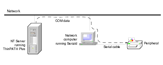 For example, as an NT application transmits data to a standard COM port, ThinPATH Plus intercepts the data and redirects it to the network computer located on the network. Upon receiving the data, the Seriald daemon passes the data on to the network computer serial port where the peripheral device is connected.