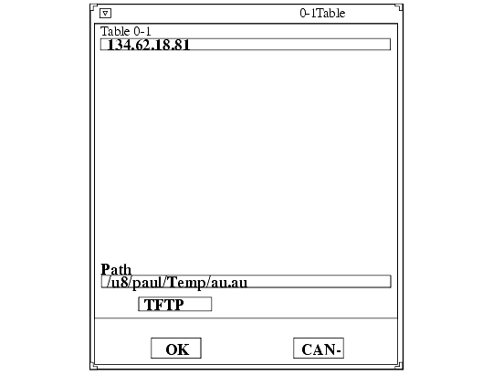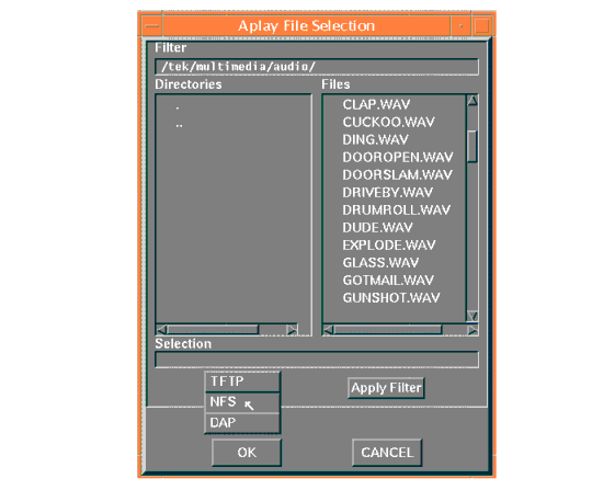 - To select the access method to use, position the mouse pointer on the NFS button and click. A drop down menu displays the available methods: TFTP, NFS, or DAP. The File Selection window changes to reflect the chosen access method.