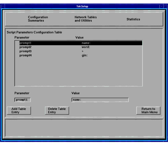 When you choose to connect via a script, the value you enter in the Script field names the parameter listed in Setup's Network Tables and Utilities > Script Parameters. (See Figure 5-32 on page 5-83.) NCBridge 3.2 (or higher) ships with three sample scripts (start_ppp, start_man, and start_isp) found in the /tekxp/boot/config/script directory. The first of these is the default script when you select Script as your connection method in the Session Manager Configuration Menu; the second starts when you select Manual; the third is included only as an example. You may use these scripts or create your own.