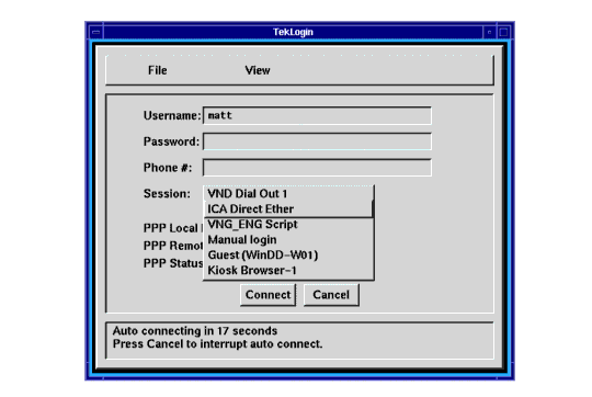 TekLogin is a new local client that simplifies the connection process, not just for PPP connections, but for other Host connections as well. This method is recommended, especially in environments where the system administrator wishes to simplify the login procedure for inexperienced users. See the TekLogin Local Client topic on page 5-64 for more information.