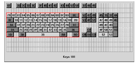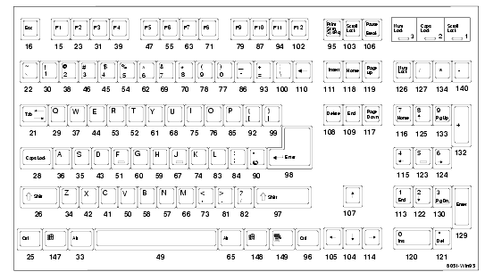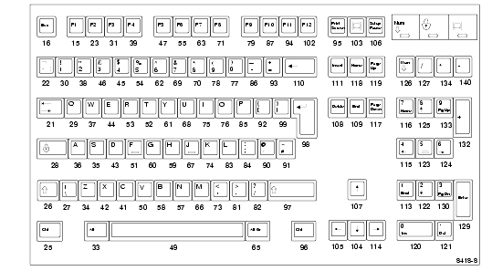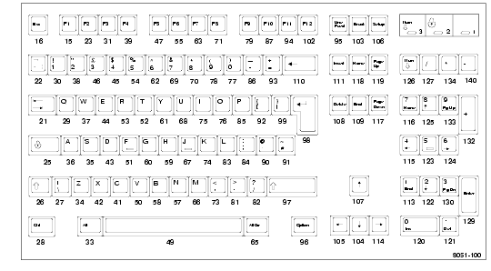 Figures A-1 through A-11 show examples of the standard types of keyboards available with the network computers. Refer to Appendix B, Keyboards in the NCBridge Reference Manual for information about the key codes (the numbers below the keys in the following figures).